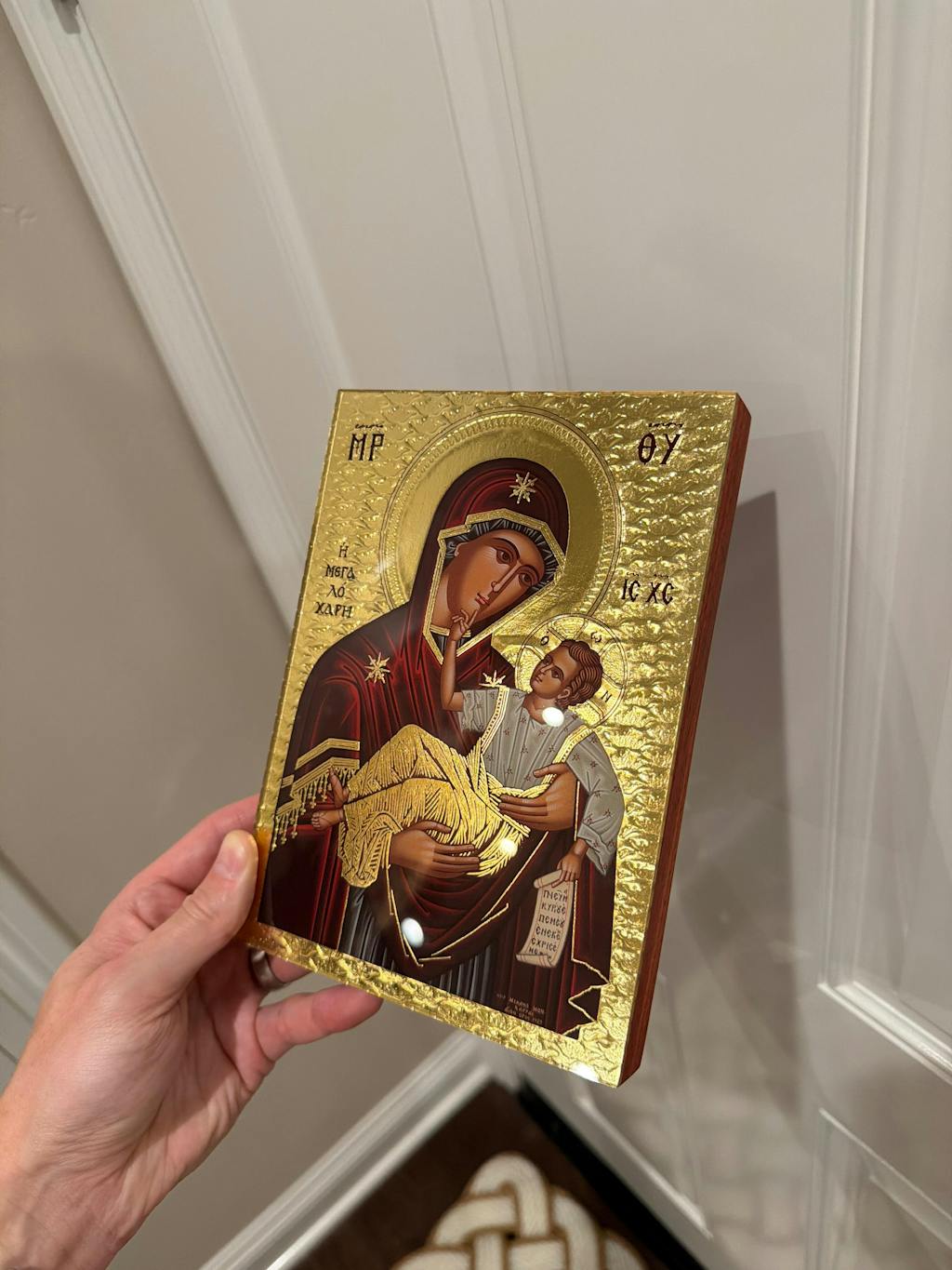 I purchased the rearview mirror icon of Theotokos as gift to add to my Goddaughters Easter Lambatha candle it is so beautiful and I know she and my Koumbari are going to love it as much as I do. The craftsman ship of this and all of your icons are so beautiful!